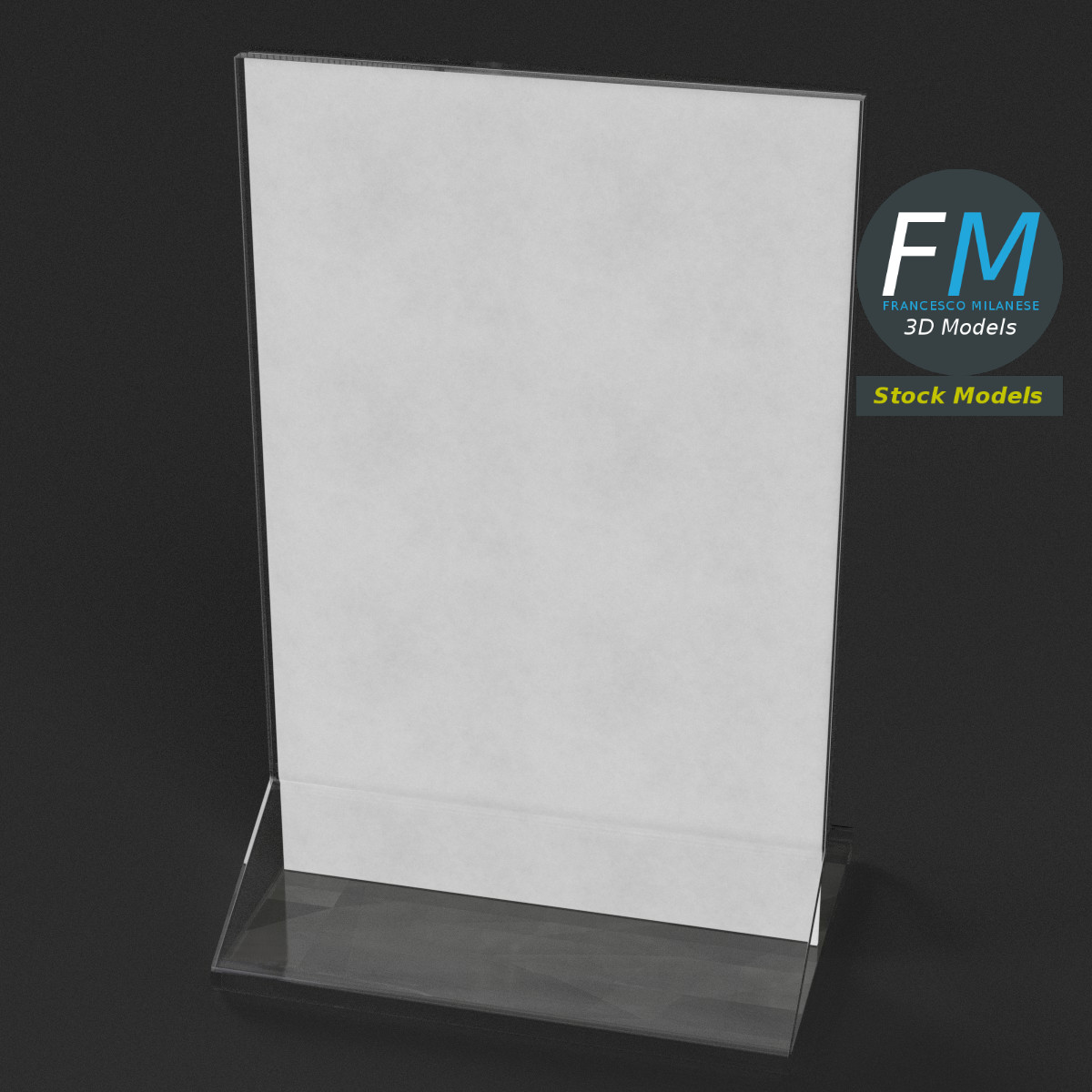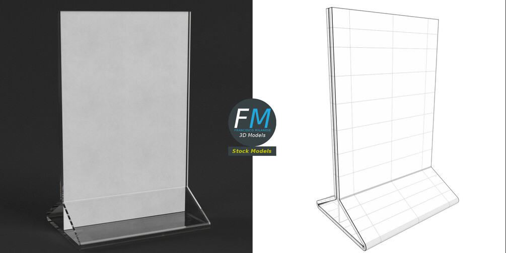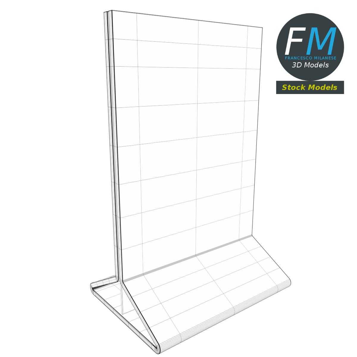 Table tent flyer template 3D Model, nr. 4 in my collection; perfect for advertising, mockups, etc. 2 objects (frame, paper), each one with its own non overlapping UV Layout map, Material and PBR Textures set. Production-ready 3D Model, with PBR materials, textures, non overlapping UV Layout map provided in the package.