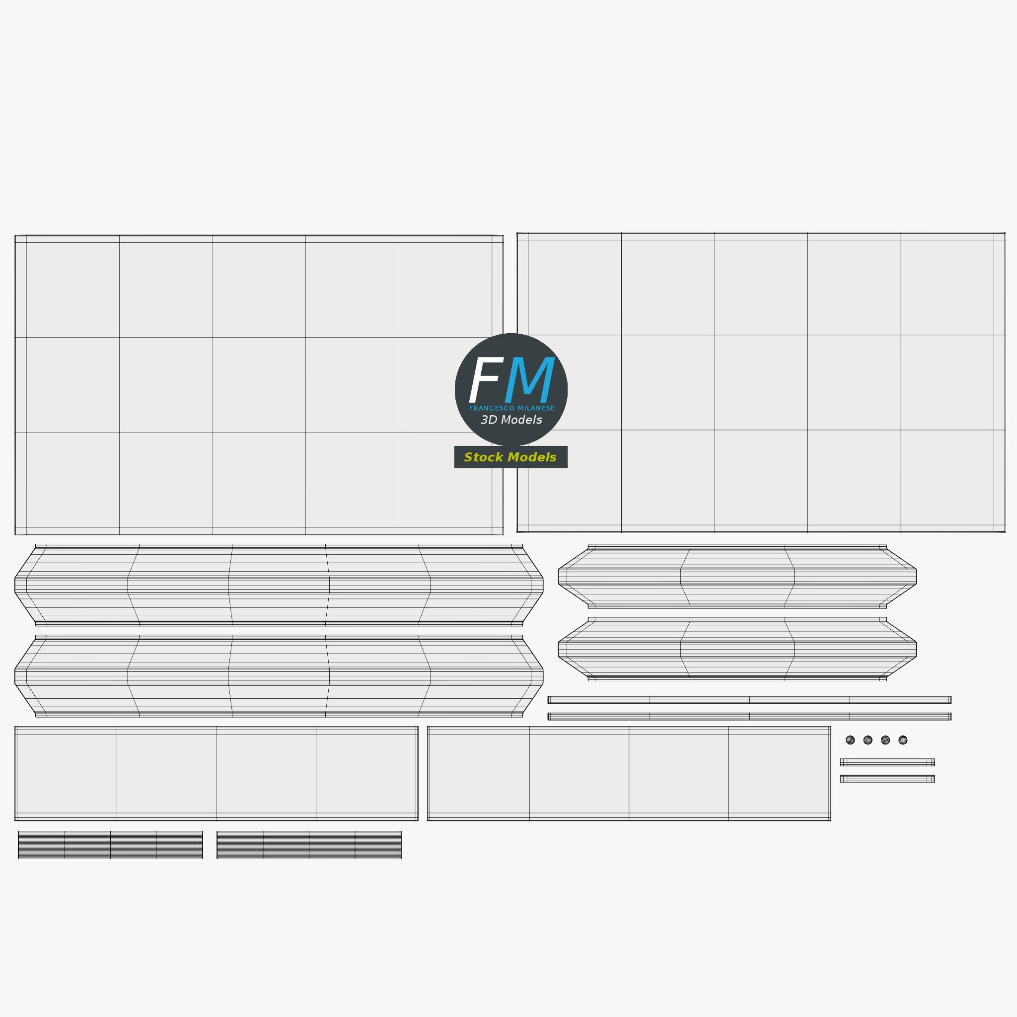 Easily customizable: UV unwrapped geometries; UV Layout maps provided in the package as png with alpha images.