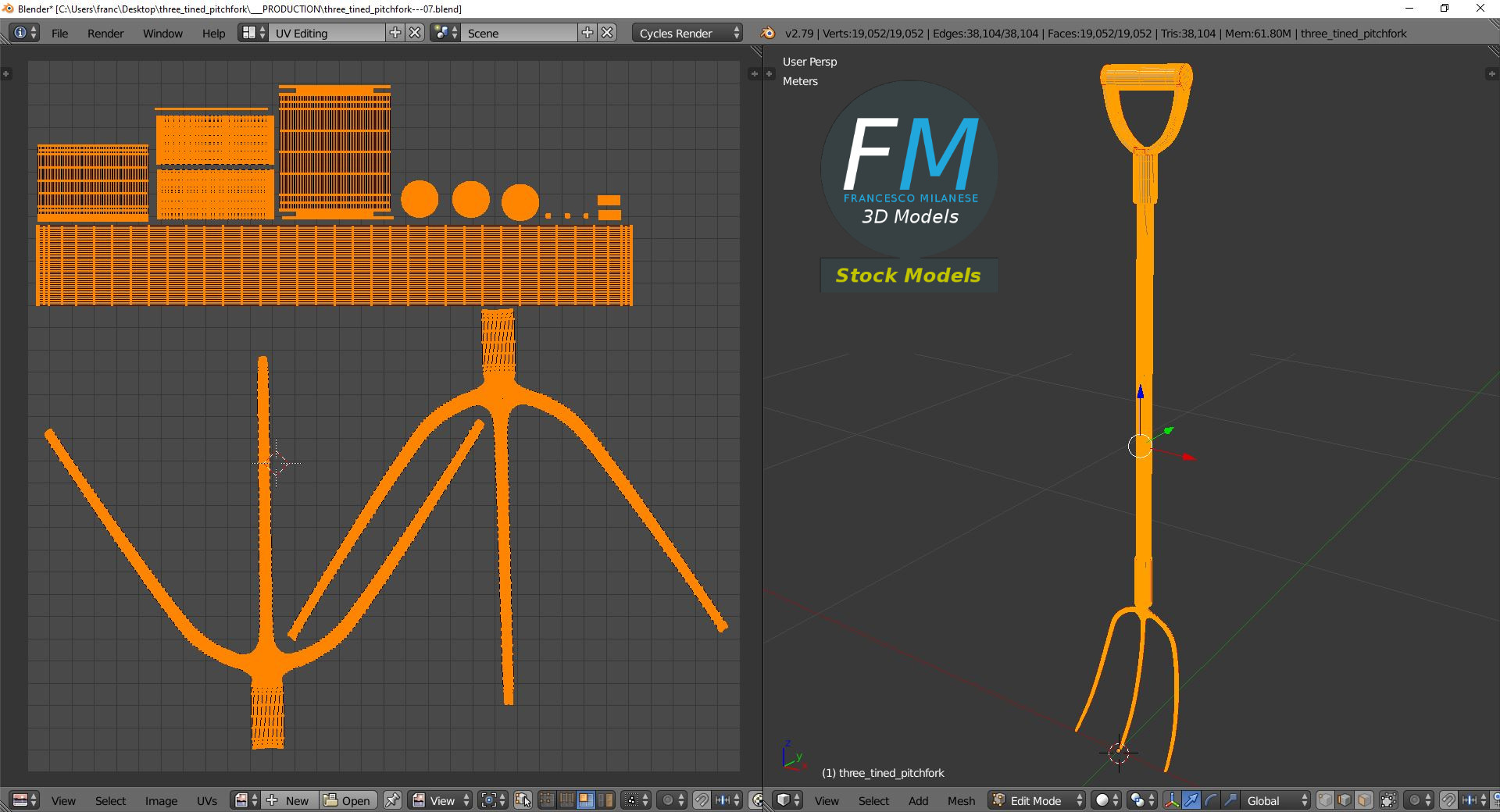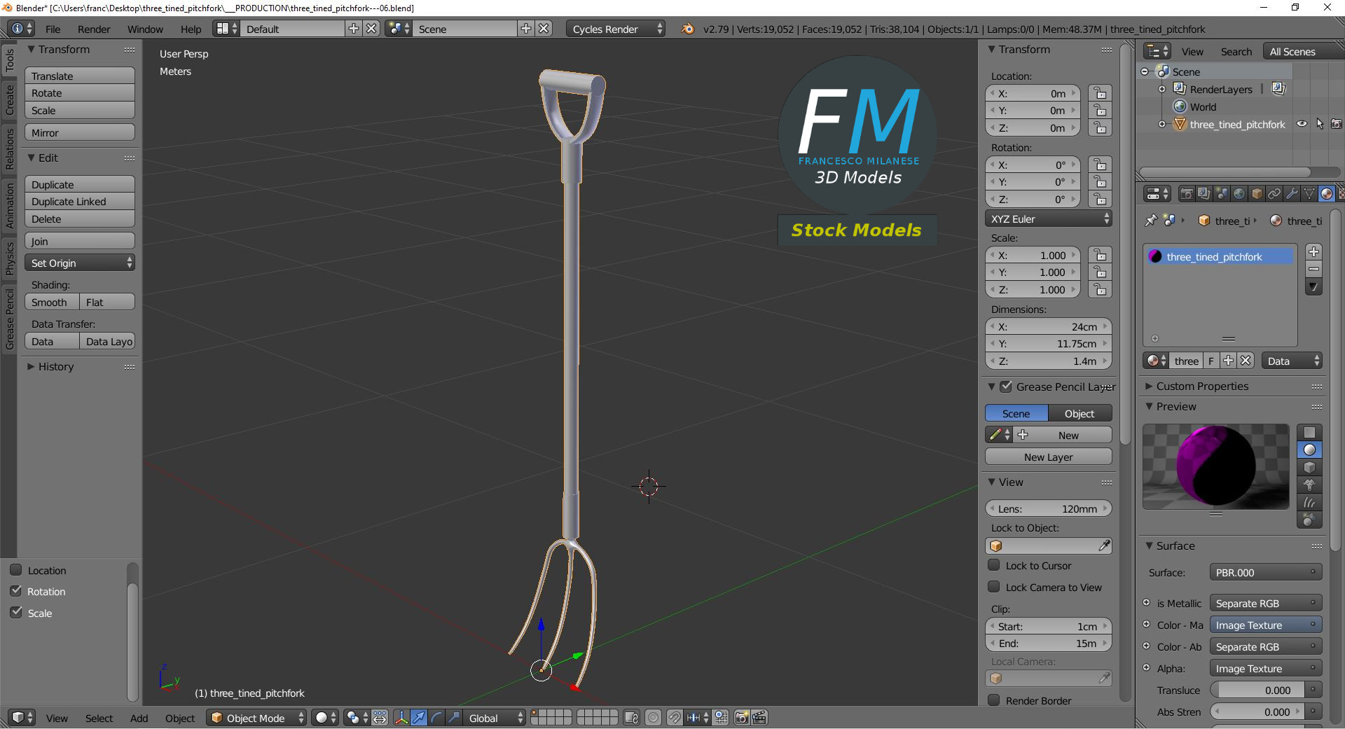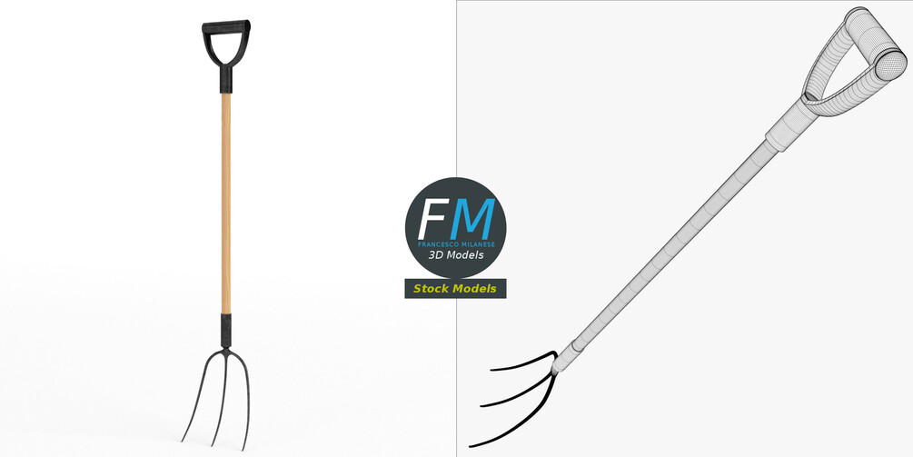 Three-tined pitchfork 3D Model. Production-ready 3D Model, with PBR materials, textures, non overlapping UV Layout map provided in the package.