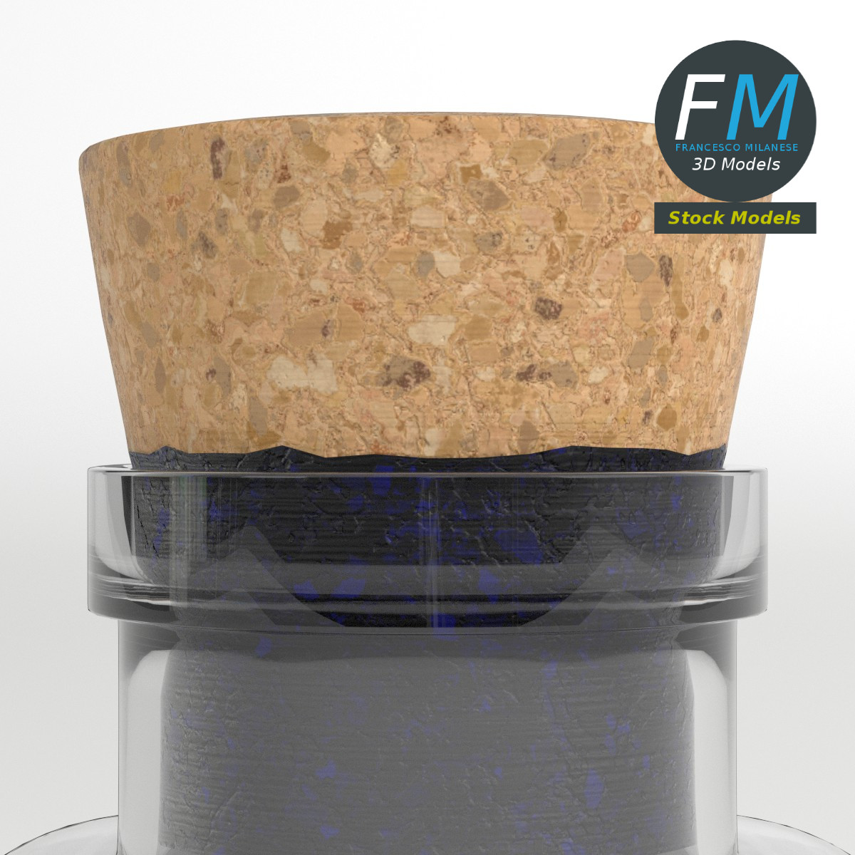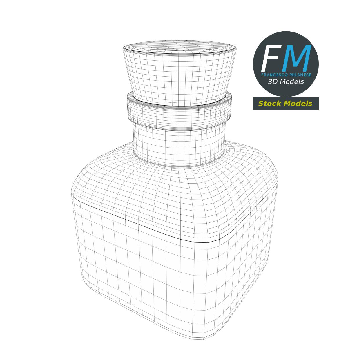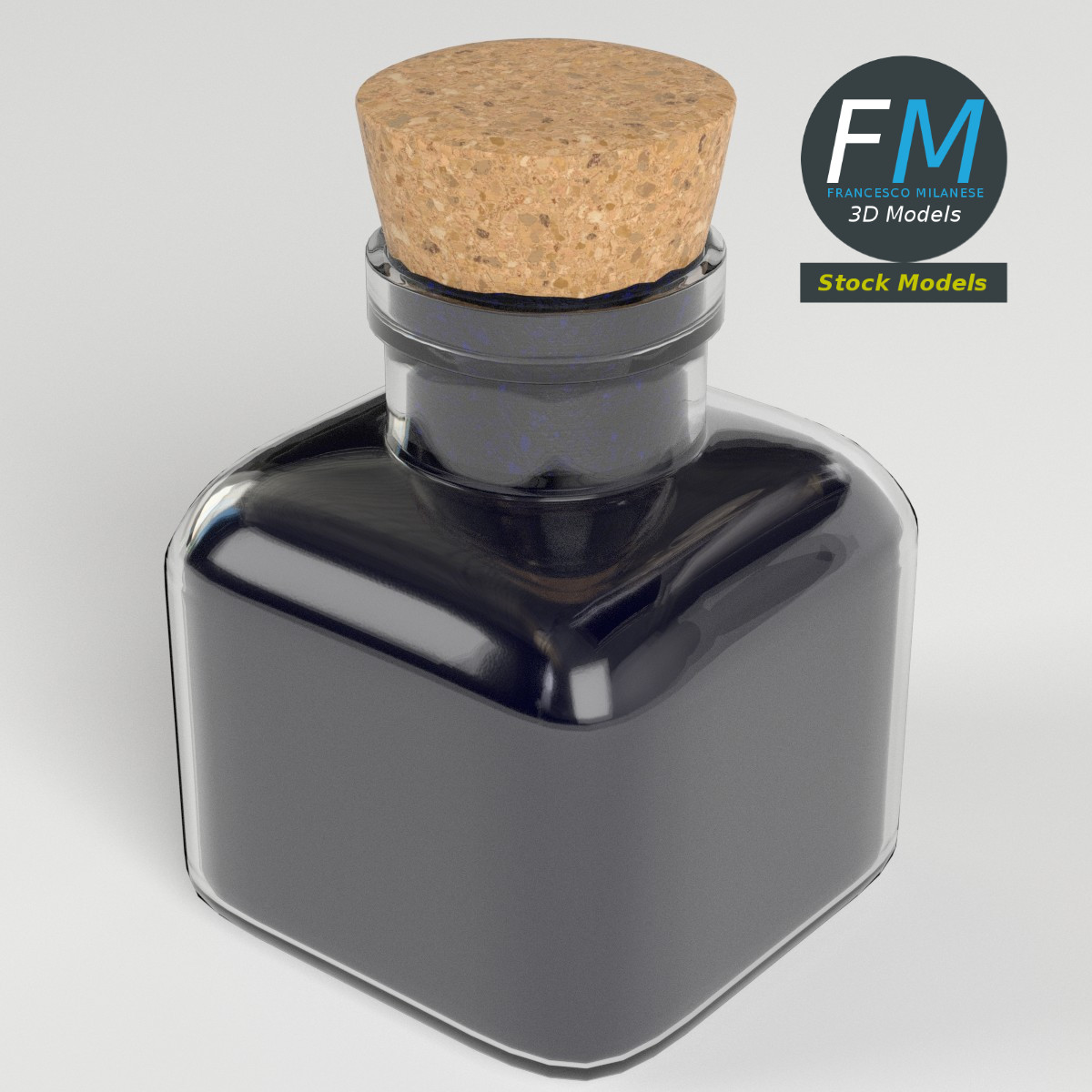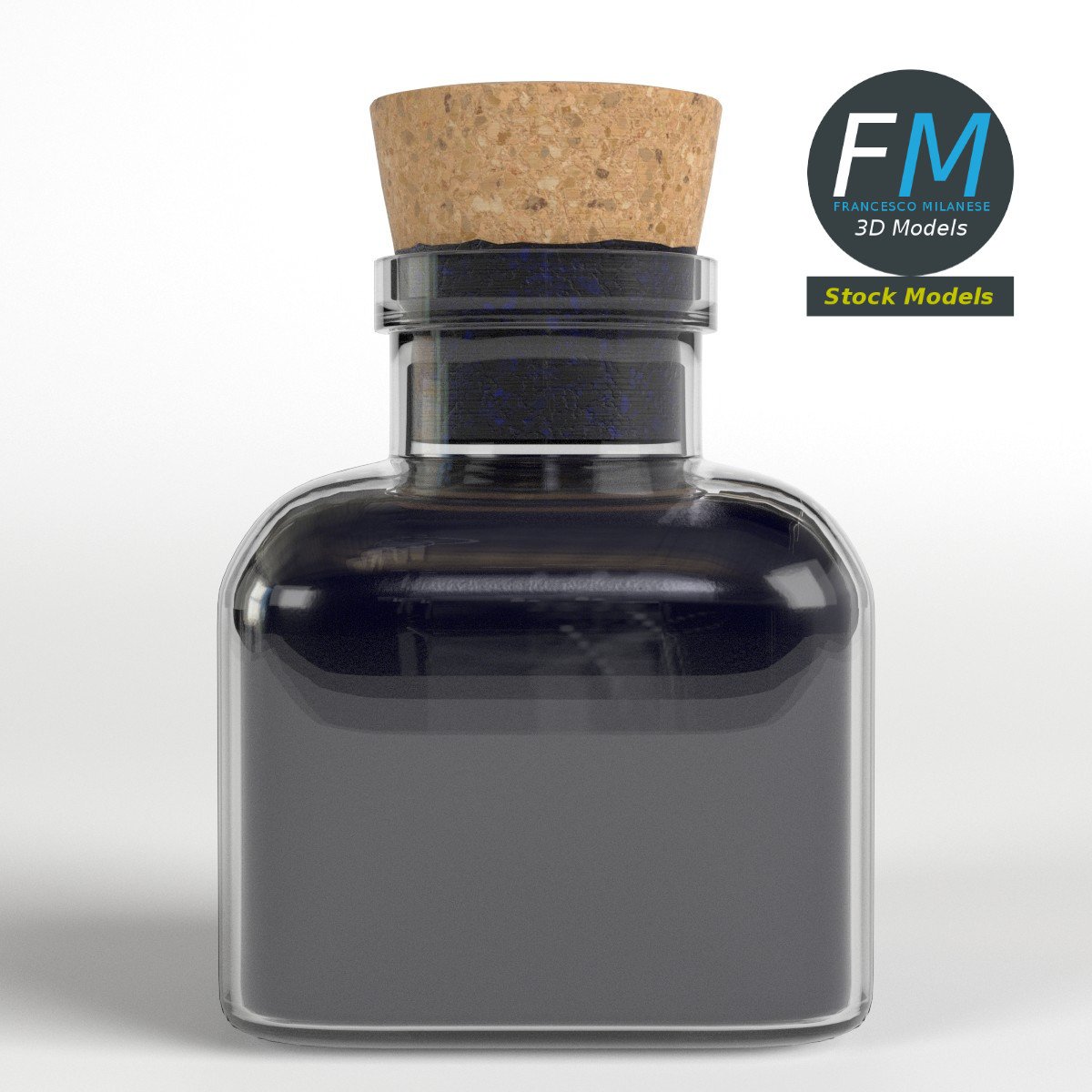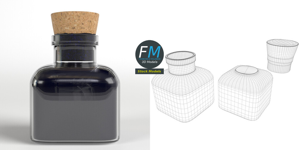 Vintage ink bottle 3D Model. 3 objects (bottle, ink, top), parented, each one with its own non overlapping UV Layout map, Material and PBR Textures set. Production-ready 3D Model, with PBR materials, textures, non overlapping UV Layout map provided in the package.