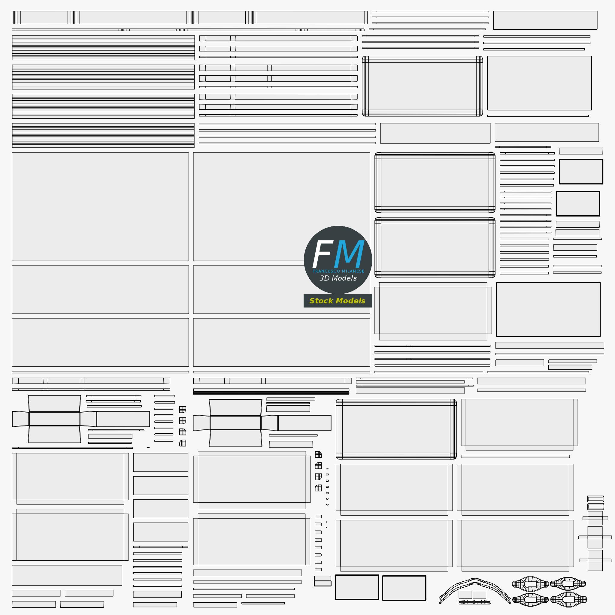Easily customizable: UV unwrapped geometries; UV Layout maps provided in the package as png with alpha images.