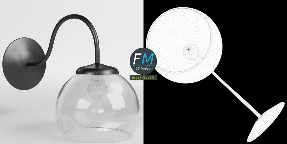 Wall light 3D Model, nr. 1 in my collection. 3 individual objects (frame, glass, bulb; so, you can easily assign an emitting material to the bulb), each one with its own non overlapping UV Layout map, Material and PBR Textures set. Production-ready 3D Model, with PBR materials, textures, non overlapping UV Layout map provided in the package.