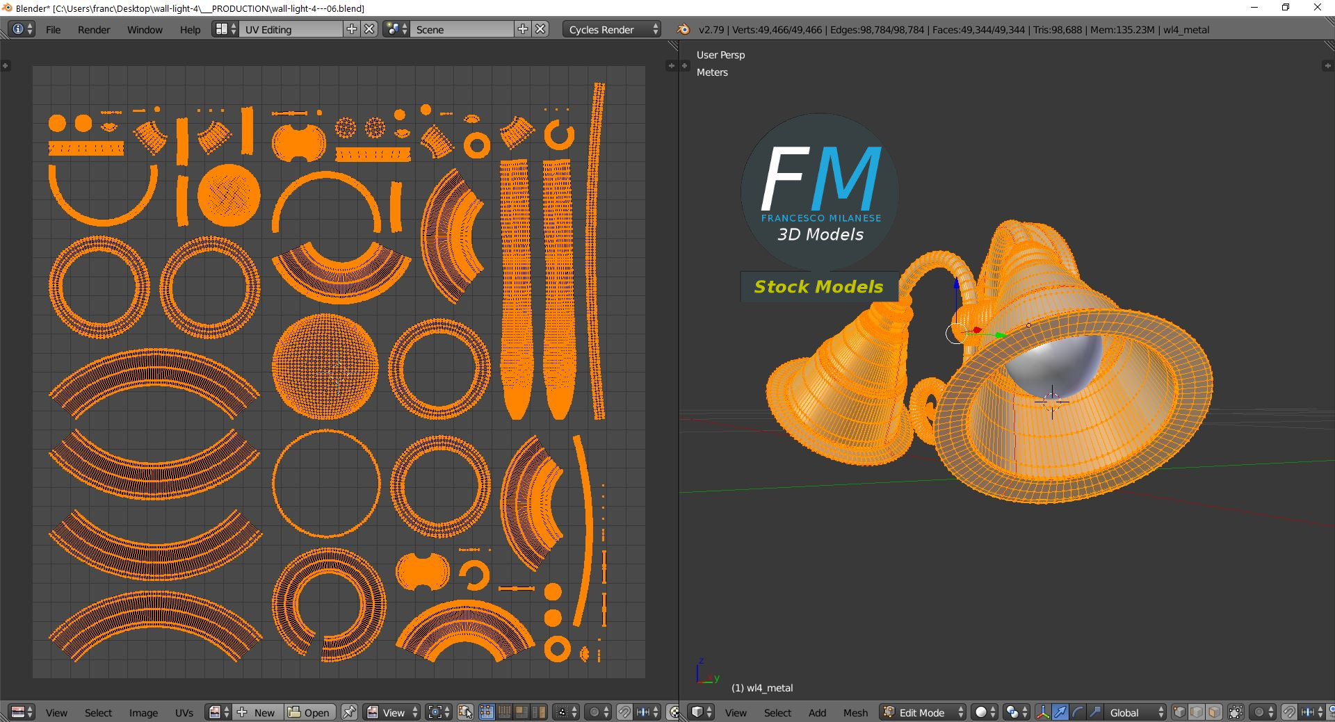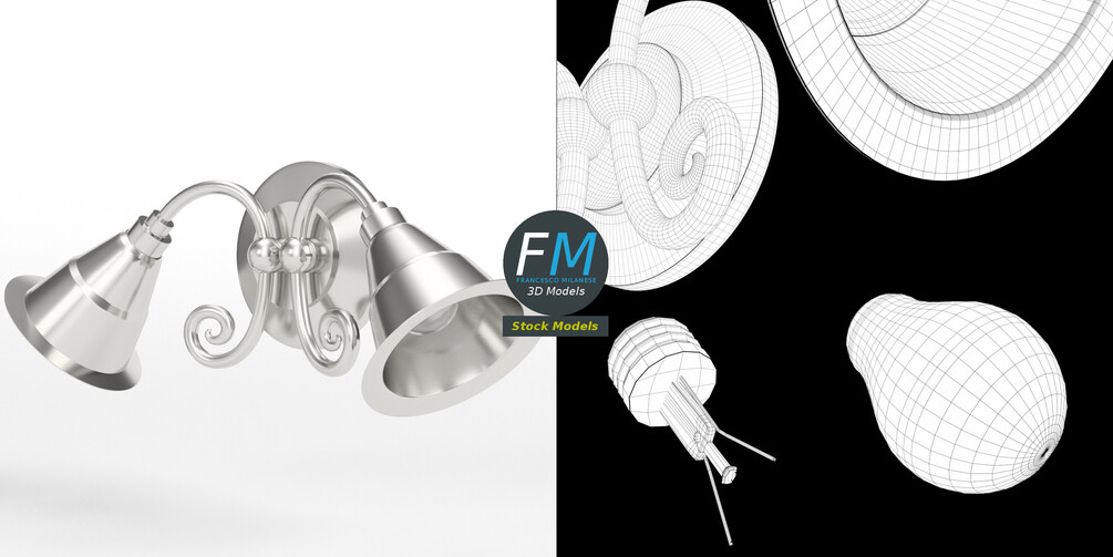 Wall light 3D Model, nr. 4 in my collection. 3 individual objects (frame, lamp 1, lamp 2), sharing 2 non overlapping UV Layout maps, Materials (frame, glass) and PBR Textures sets. Production-ready 3D Model, with PBR materials, textures, non overlapping UV Layout map provided in the package.
