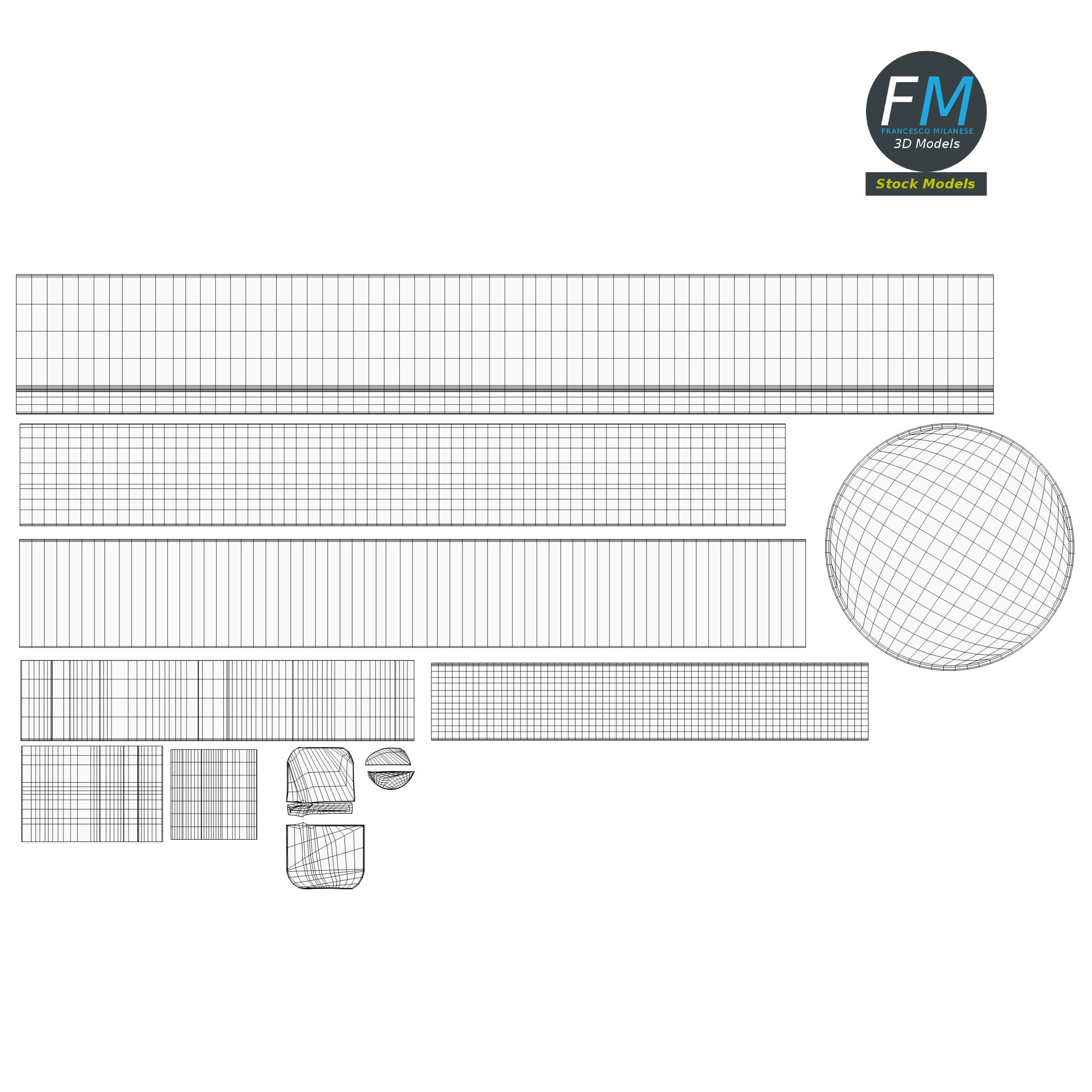 Easily customizable: UV unwrapped geometries, so you can create new Textures (or modify the existing ones) using the UV Layout maps provided in the package (as png with alpha).