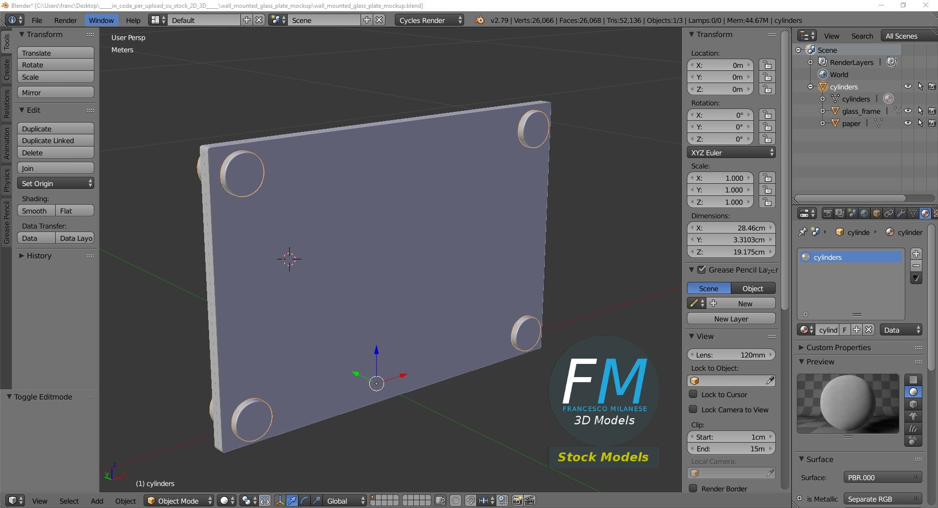 Wall mounted glass plate mockup 3D Model. 3 individual objects (paper, glass frame, cylinders; perfect for a template or a mock-up), each one with its own non overlapping UV Layout map, Material and PBR Textures set. Production-ready 3D Model, with PBR materials, textures, non overlapping UV Layout map provided in the package.