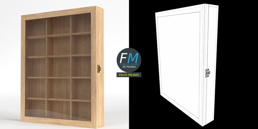 Wall mounted wooden showcase 3D Model, nr. 3 in my collection. 4 individual objects (base, cover, glass panel, latch), sharing 2 non overlapping UV Layout maps, Materials (glass, opaque) and PBR Textures sets. Production-ready 3D Model, with PBR materials, textures, non overlapping UV Layout map provided in the package.
