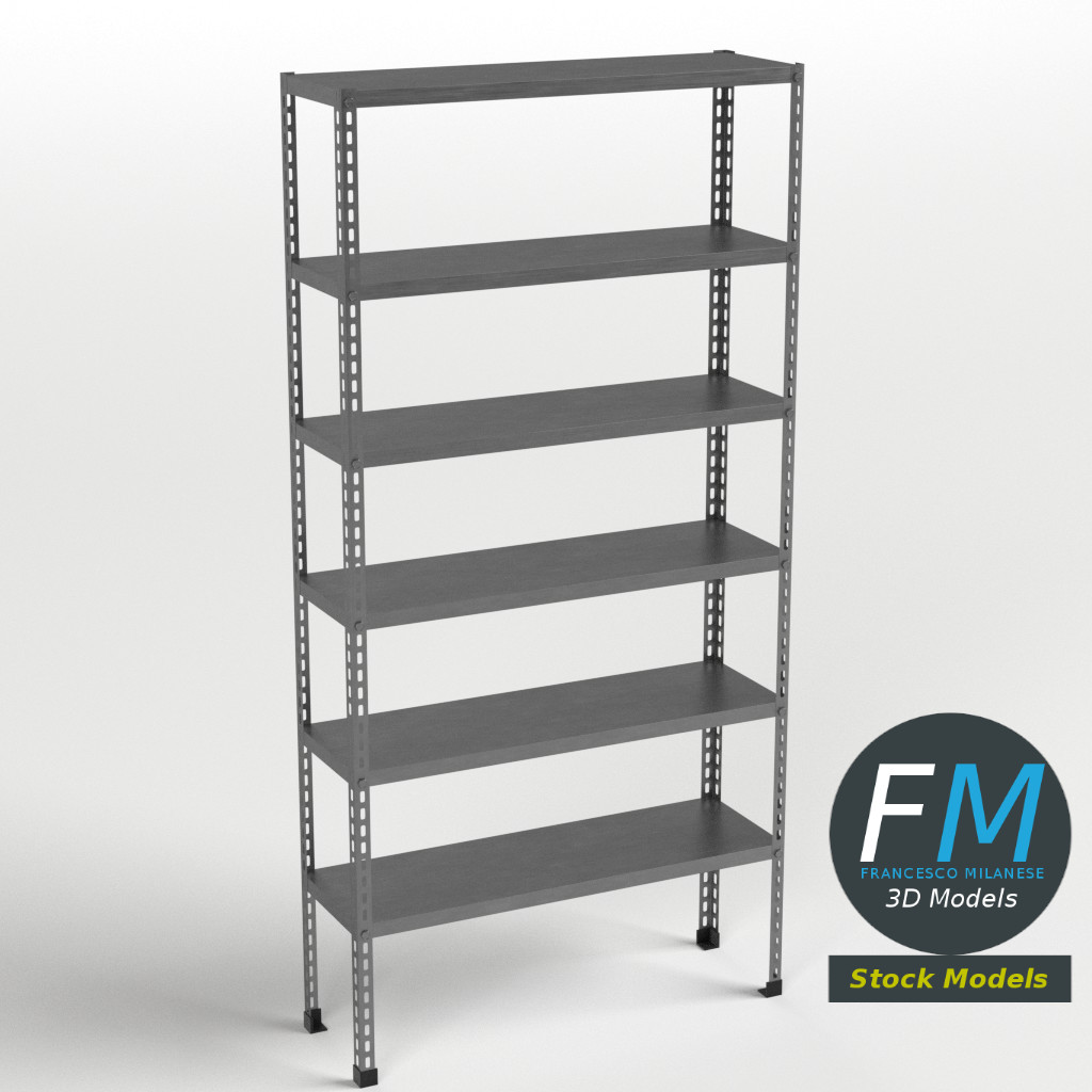 Warehouse shelf 3D Model. 3 individual objects (frame, boards, bolts and nuts), sharing the same non overlapping UV Layout map, Material and PBR Textures set. Production-ready 3D Model, with PBR materials, textures, non overlapping UV Layout map provided in the package.