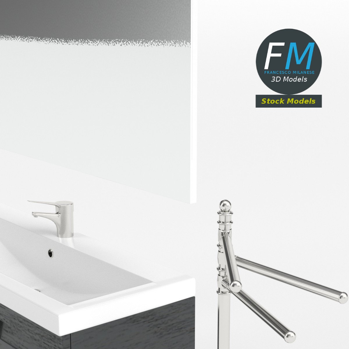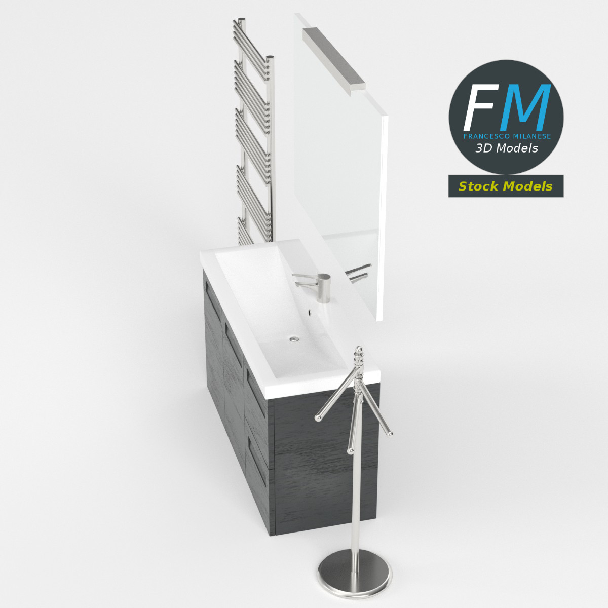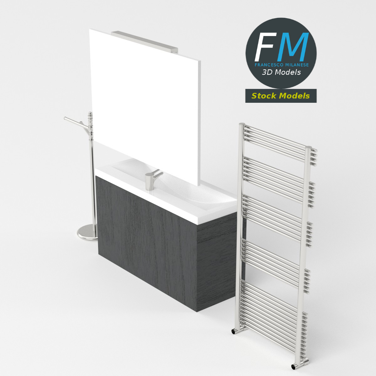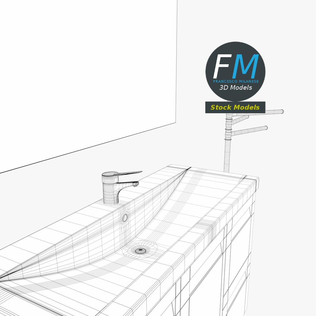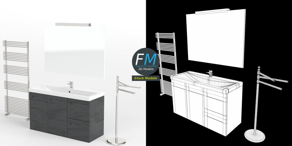 Washbasin set 3D Model, nr. 1 in my collection. 4 individual objects (towel radiator, mirror, washbasin sink, towel stand), sharing the same non overlapping UV Layout map, Material and PBR Textures set. Production-ready 3D Model, with PBR materials, textures, non overlapping UV Layout map provided in the package.