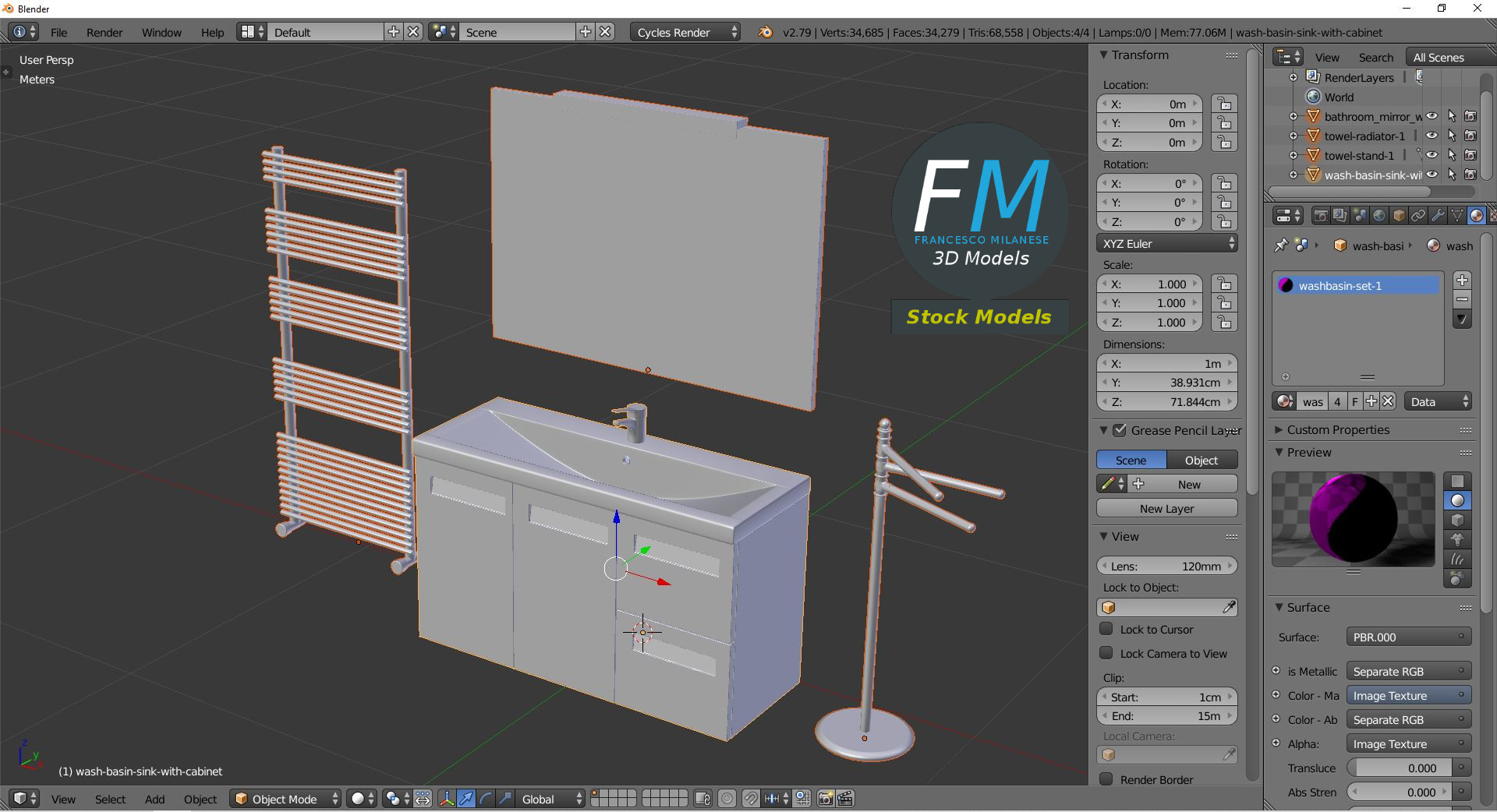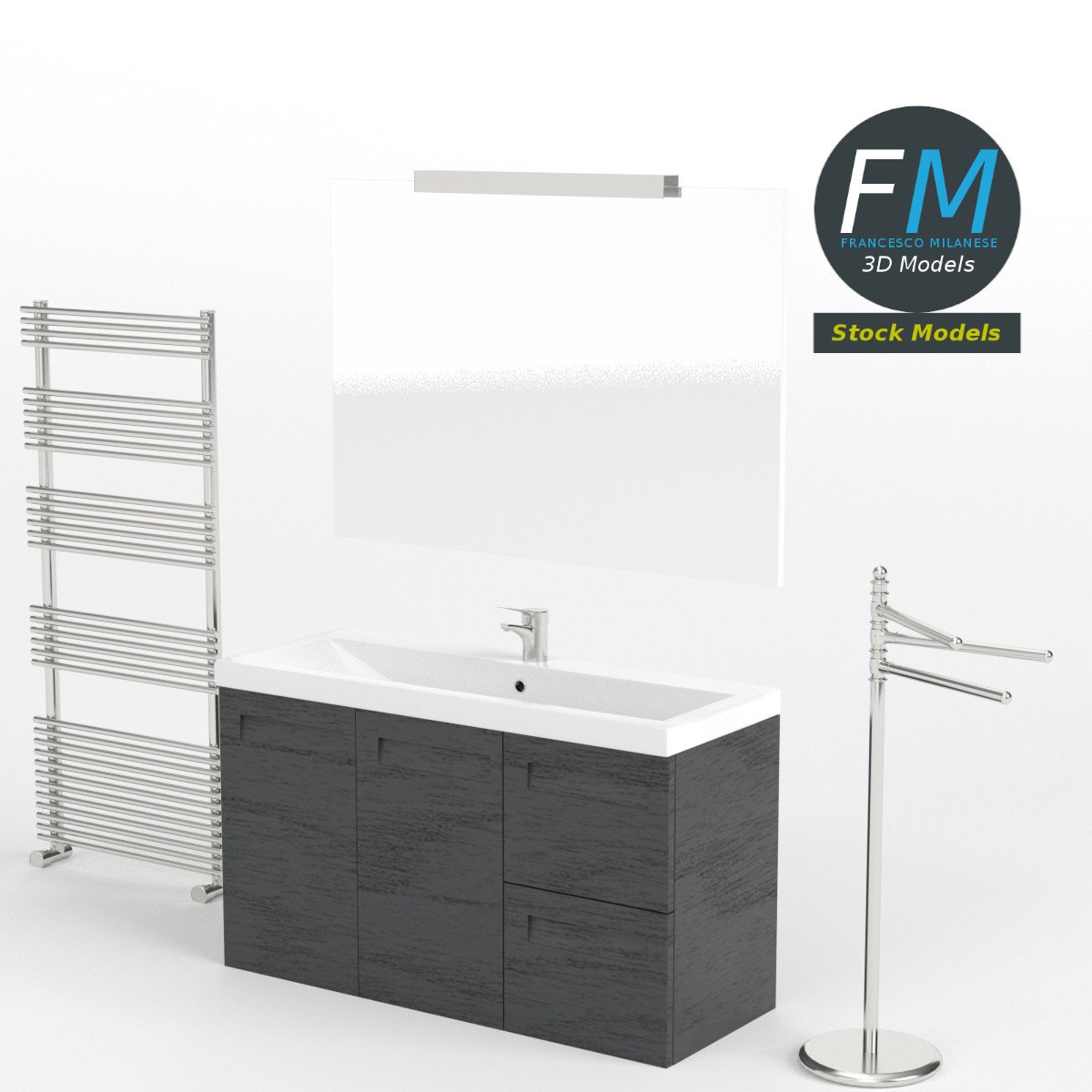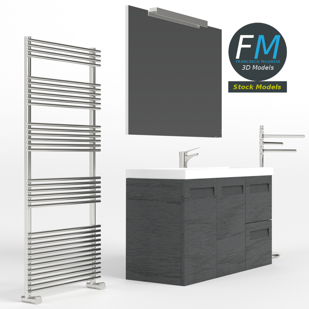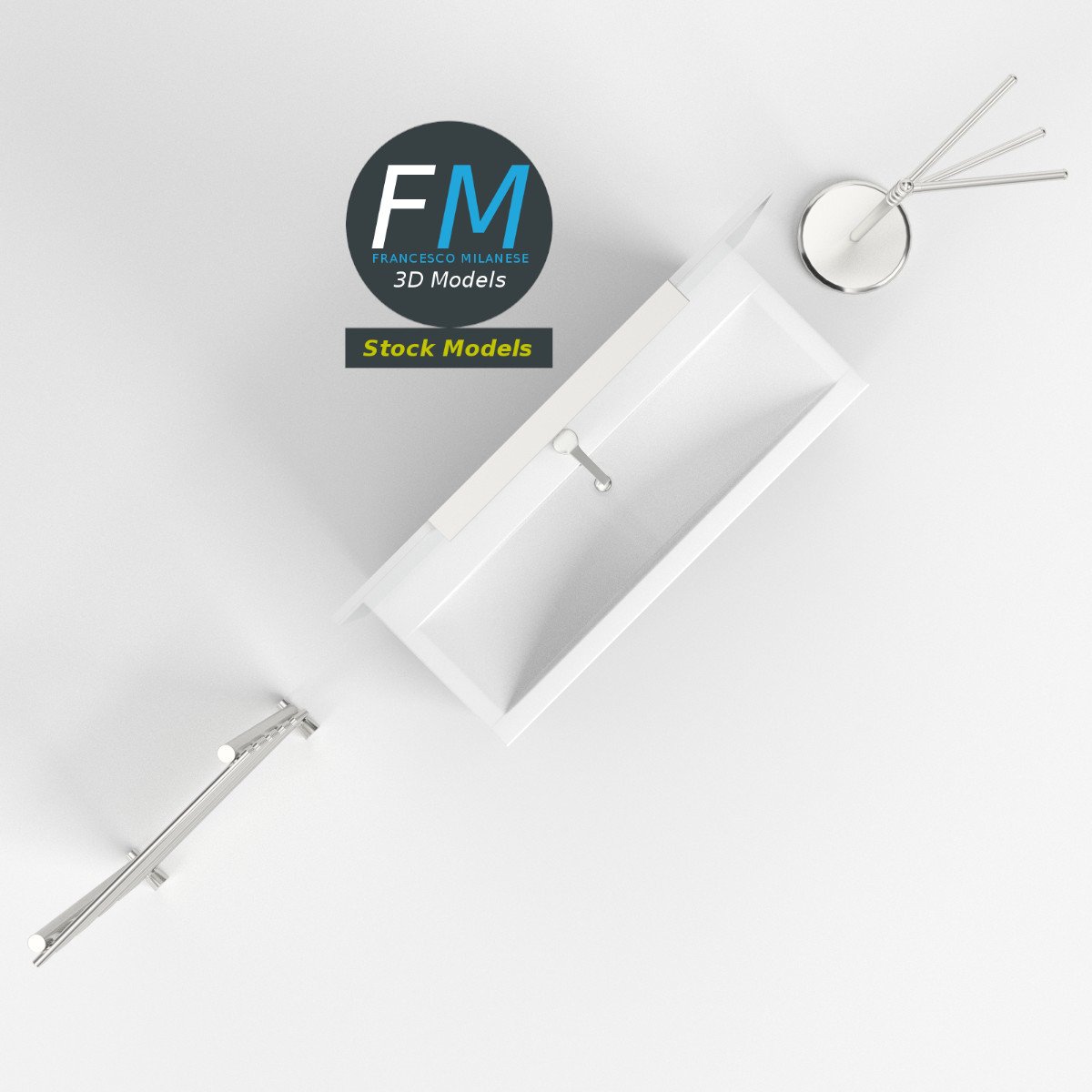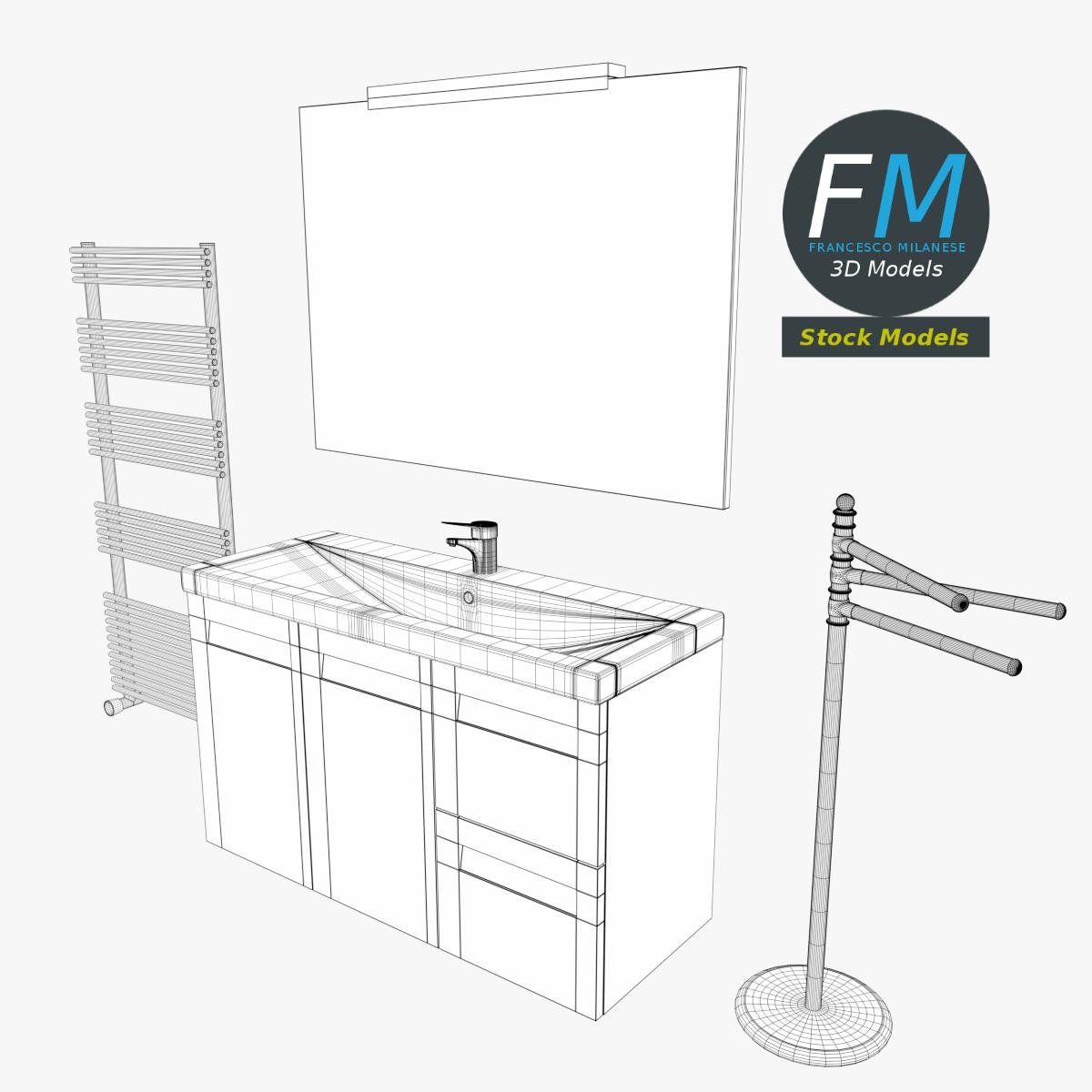 Washbasin set 3D Model, nr. 1 in my collection. 4 individual objects (towel radiator, mirror, washbasin sink, towel stand), sharing the same non overlapping UV Layout map, Material and PBR Textures set. Production-ready 3D Model, with PBR materials, textures, non overlapping UV Layout map provided in the package.
