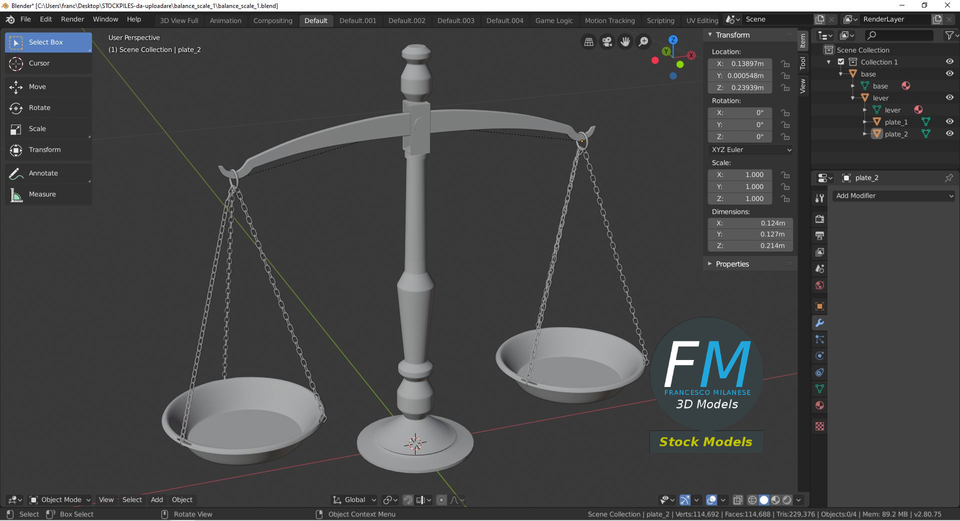 Weighing scale 3D Model, nr. 1 in my collection. 4 individual objects (base, lever, plate 1, plate 2; you can edit or even animate them) sharing the same non overlapping UV Layout map, Material and PBR Textures set. Production-ready 3D Model, with PBR materials, textures, non overlapping UV Layout map provided in the package.