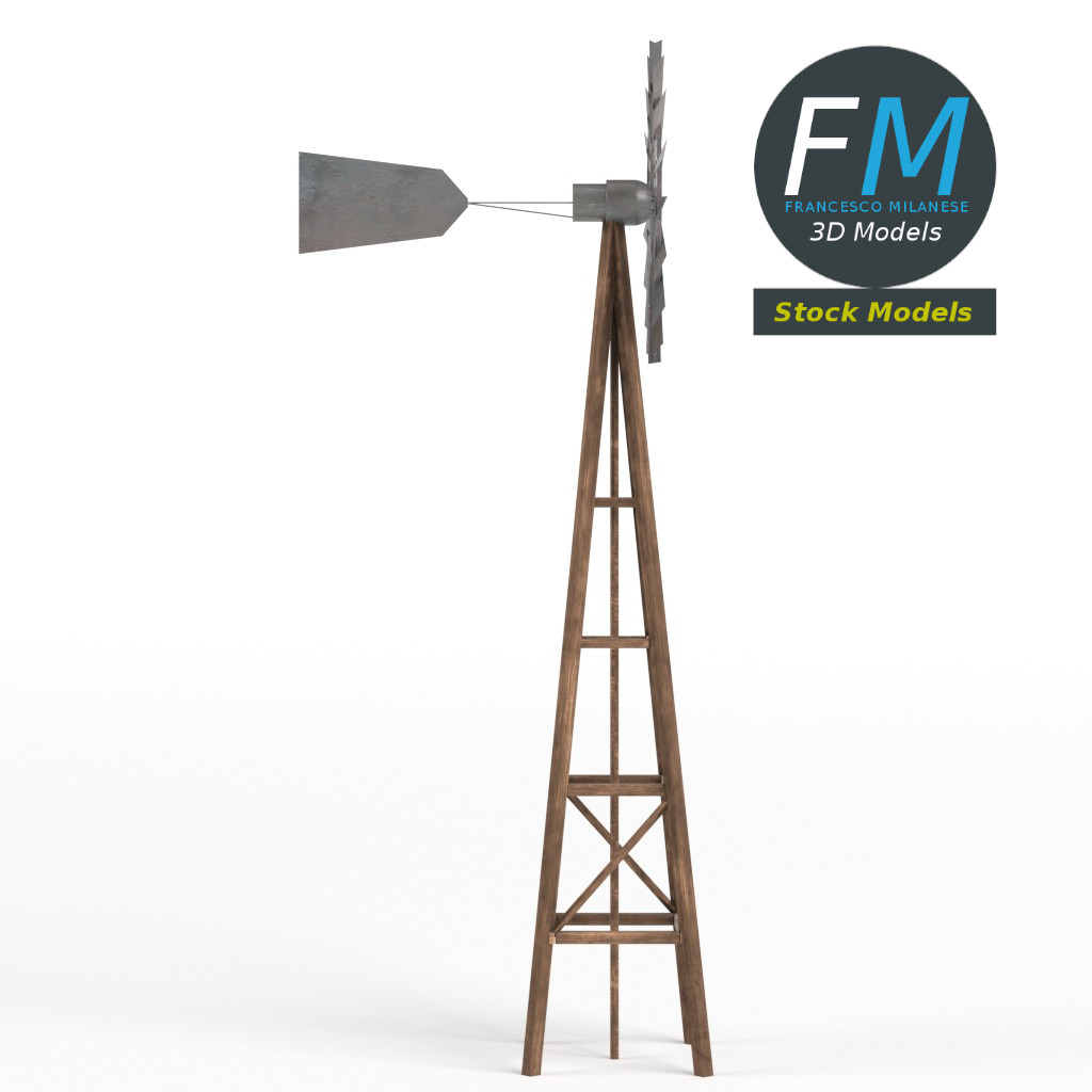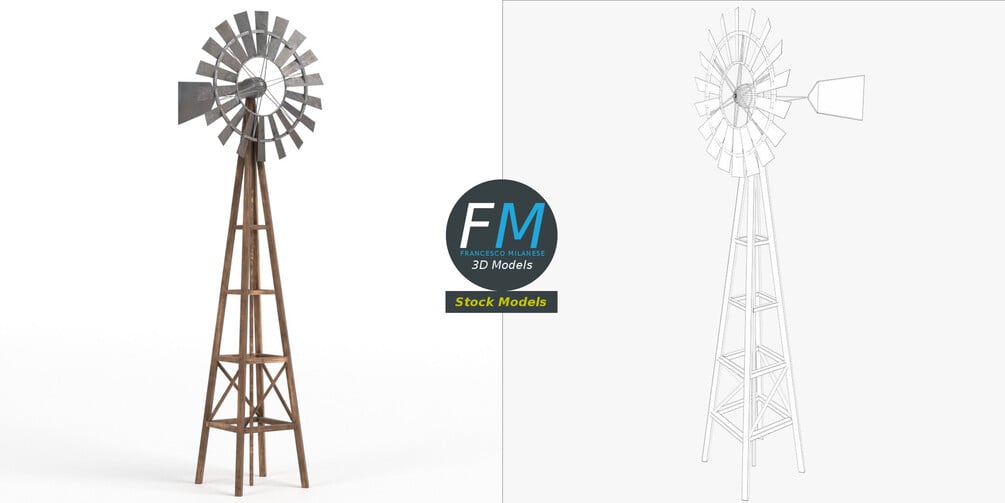 Windpump (water pumping windmill) 3D Model. 3 individual objects (tower, blades, tail; so, you can easily rotate or even animate it), sharing the same non overlapping UV Layout map, Materials and PBR Textures set. Production-ready 3D Model, with PBR materials, textures, non overlapping UV Layout map provided in the package.