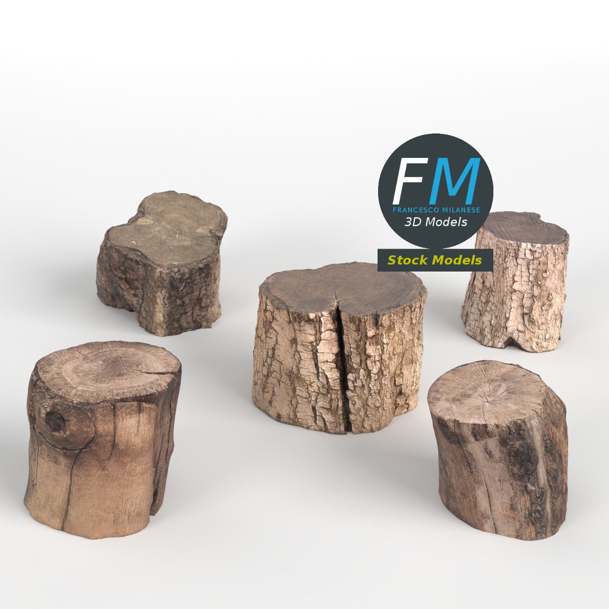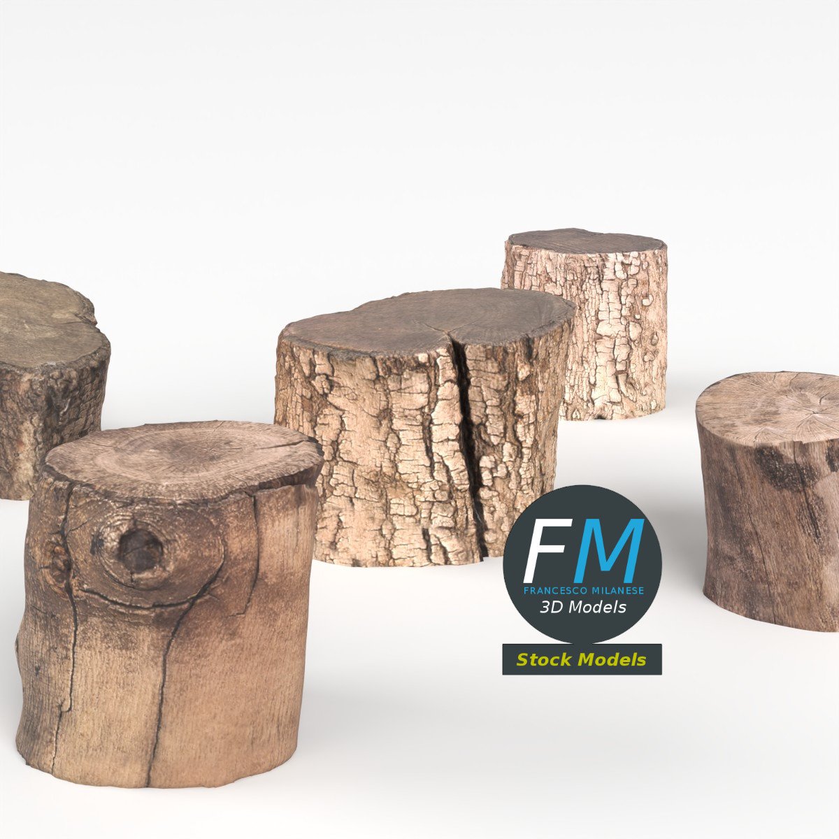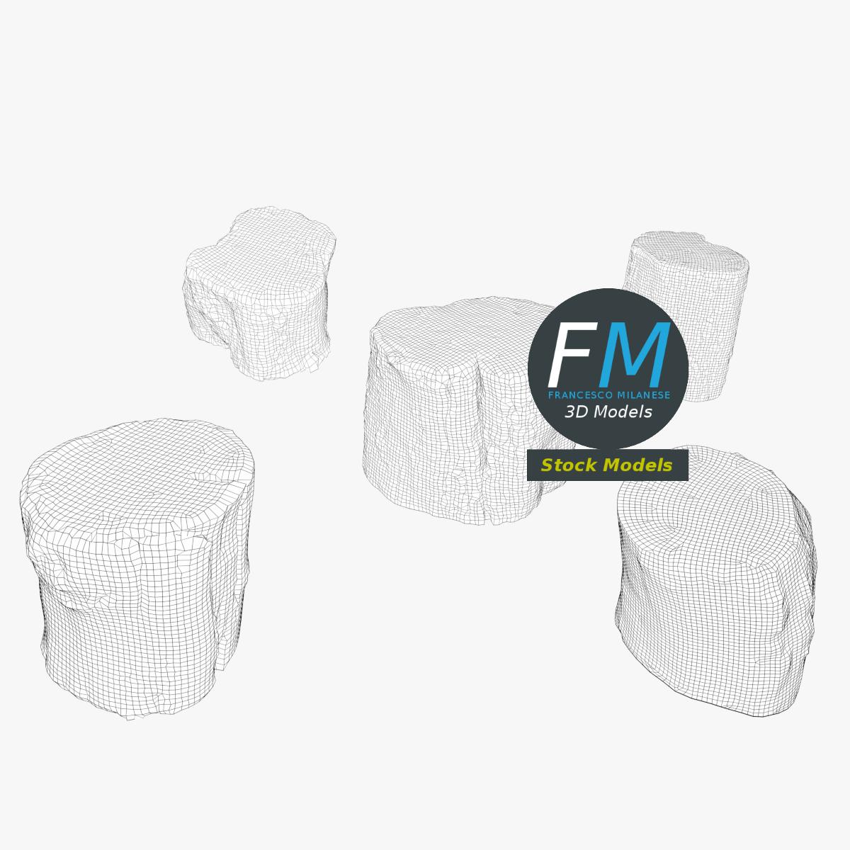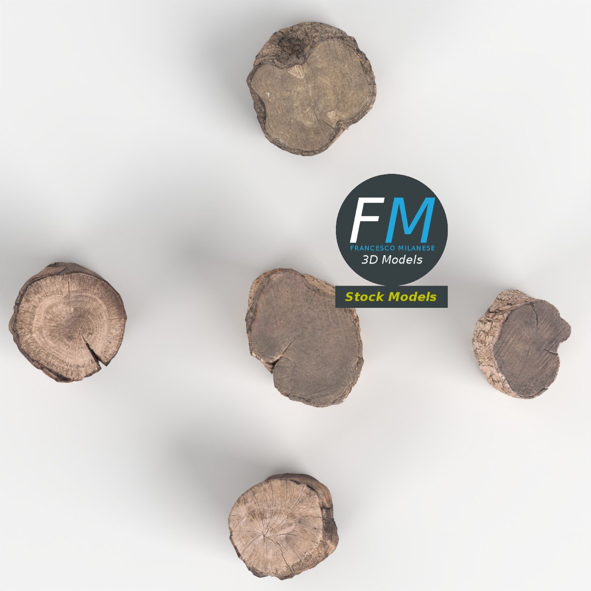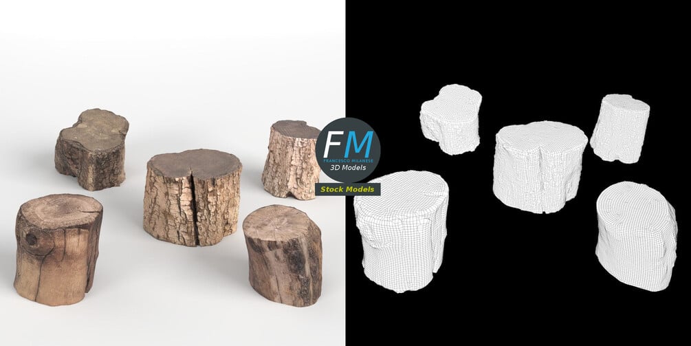 5 wood logs 3D Models, sharing the same non overlapping UV Layout map, Material and PBR Textures set. Production-ready 3D Model, with PBR materials, textures, non overlapping UV Layout map provided in the package.