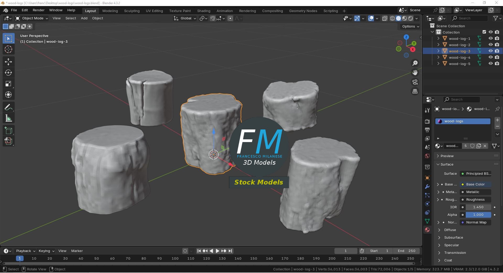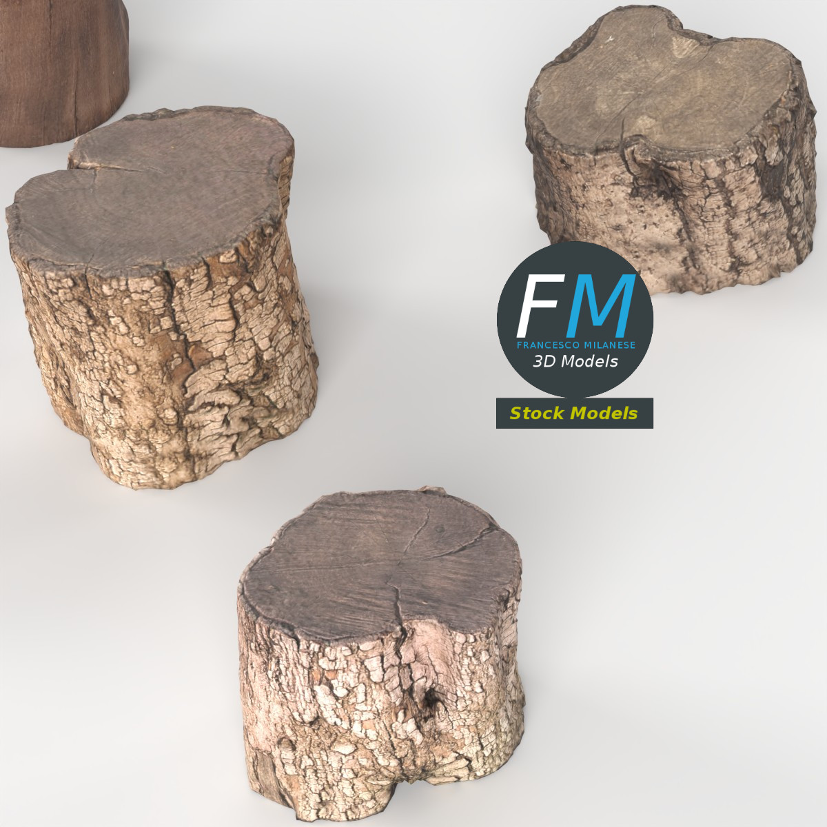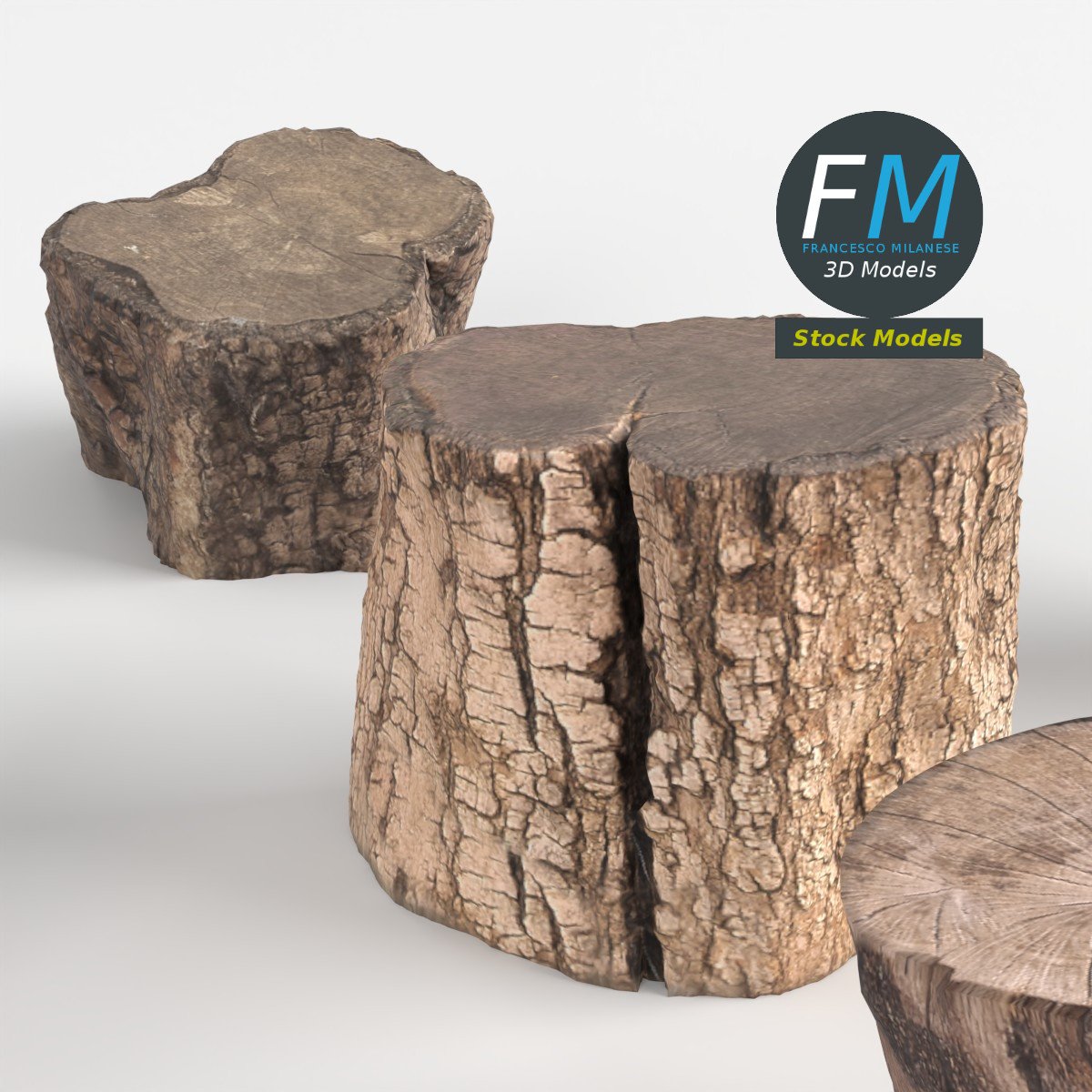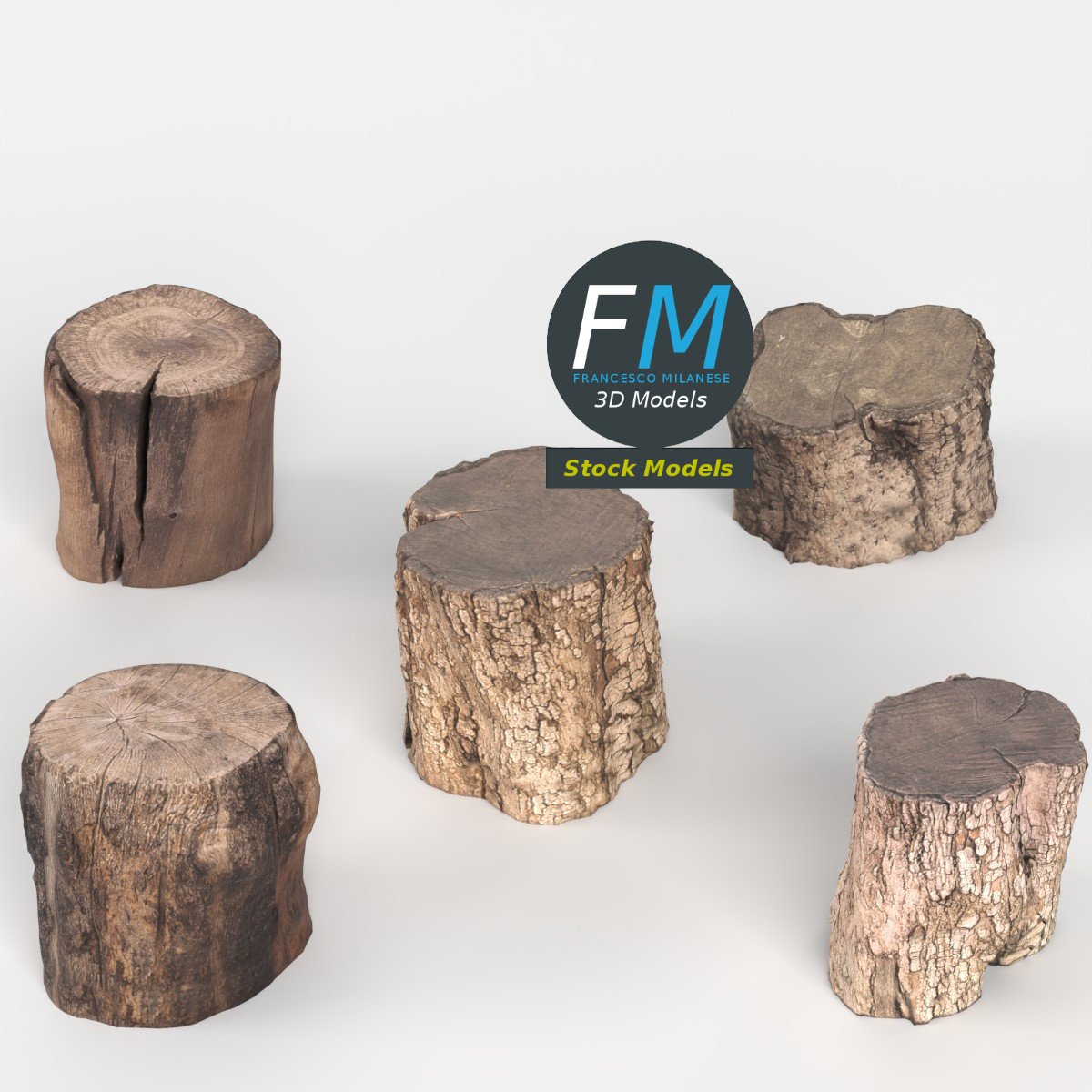 5 wood logs 3D Models, sharing the same non overlapping UV Layout map, Material and PBR Textures set. Production-ready 3D Model, with PBR materials, textures, non overlapping UV Layout map provided in the package.