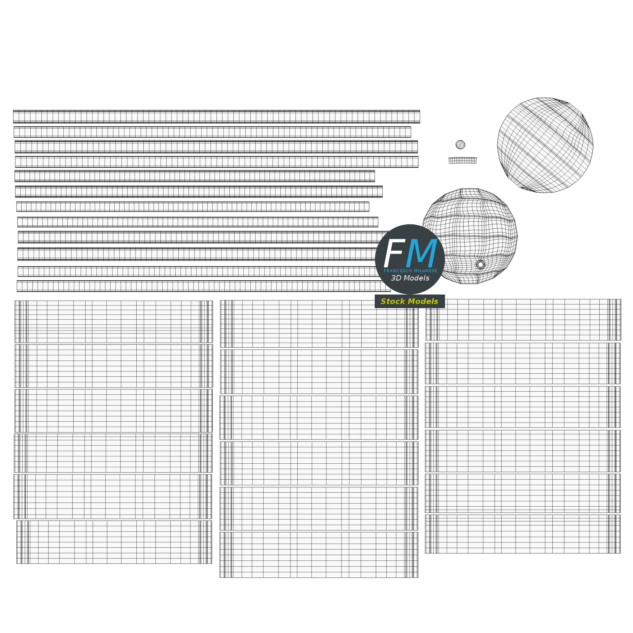 Easily customizable: UV unwrapped geometries, so you can create new Textures (or modify the existing ones) using the UV Layout maps provided in the package (as png with alpha).