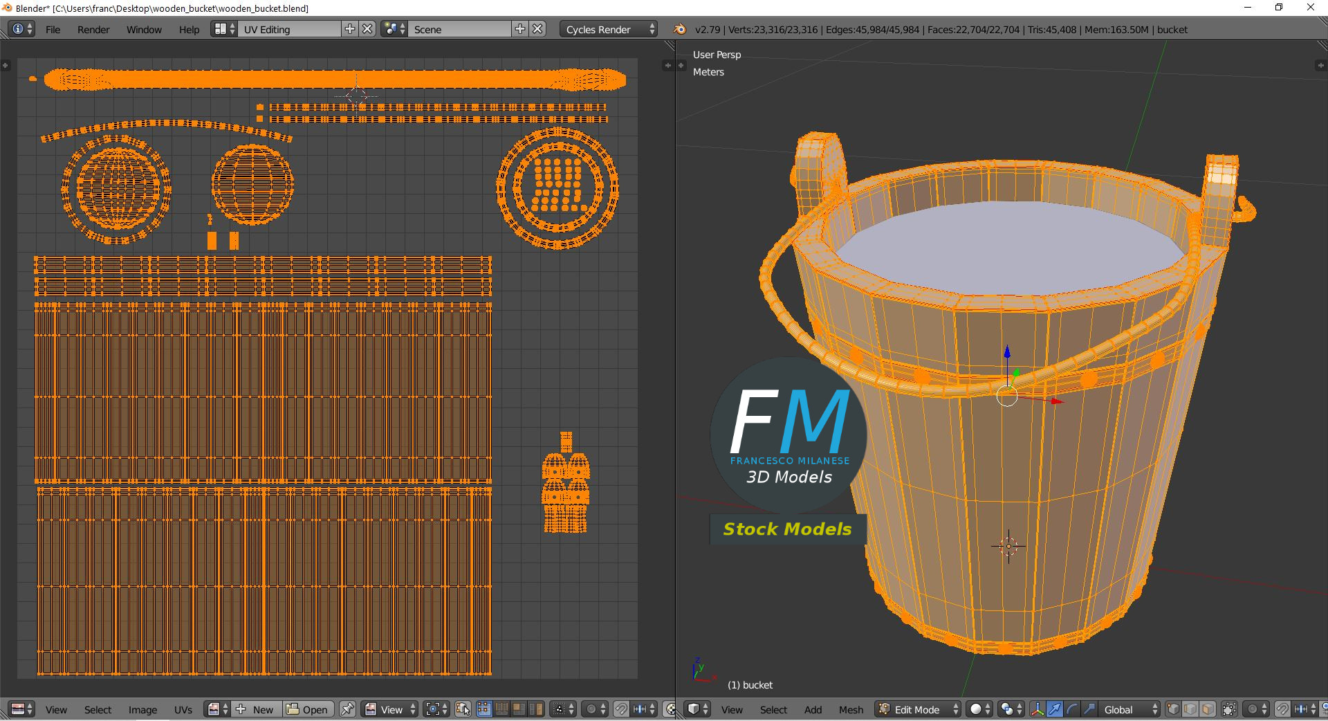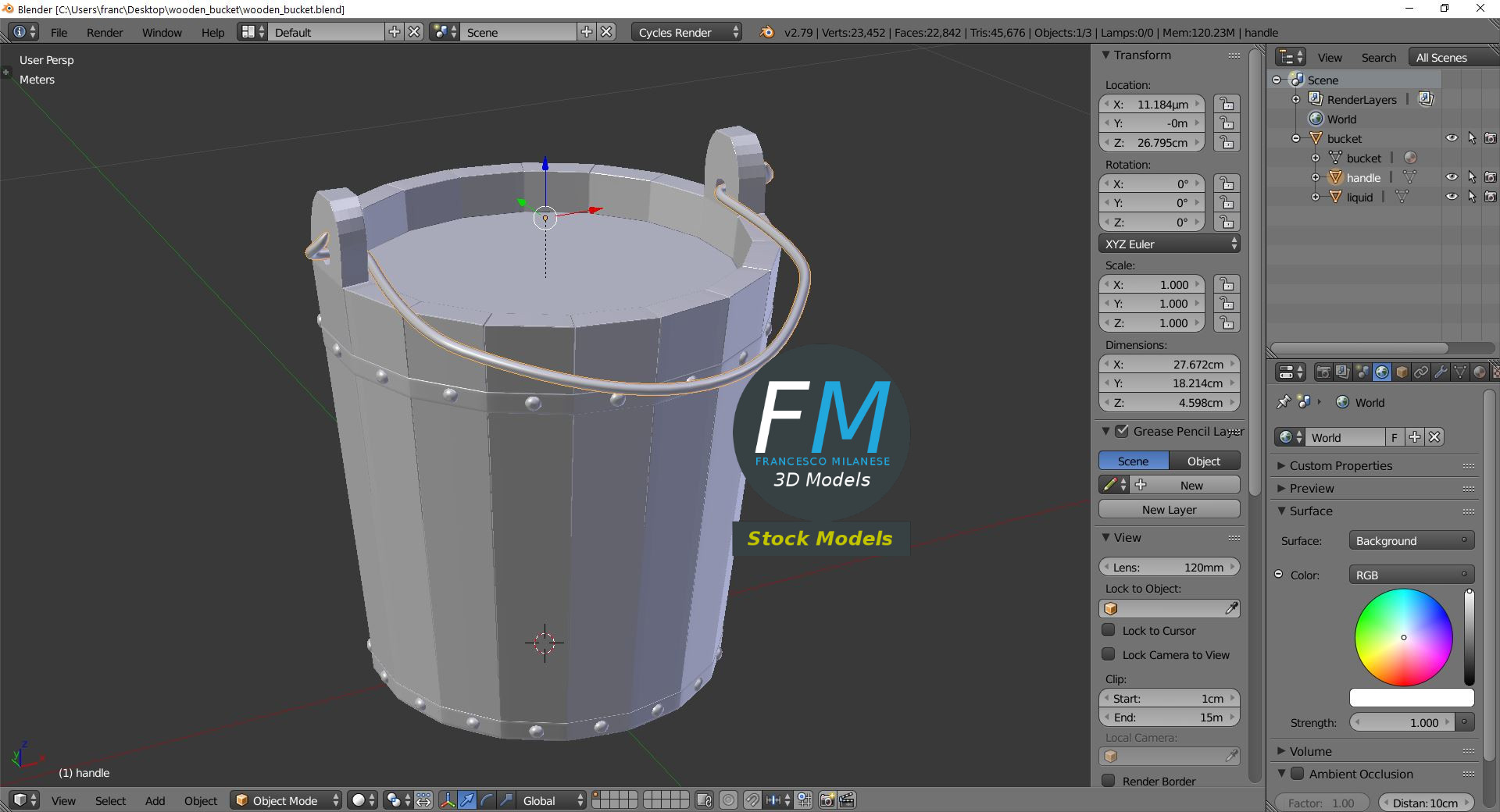 Wooden bucket 3D Model. 3 individual objects (bucket, handle, liquid; so, you can easily rotate or even animate the handle), sharing 2 individual non-overlapping UV Layout maps, Materials (bucket_and_handle, liquid) and PBR Textures sets. Production-ready 3D Model, with PBR materials, textures, non overlapping UV Layout map provided in the package.