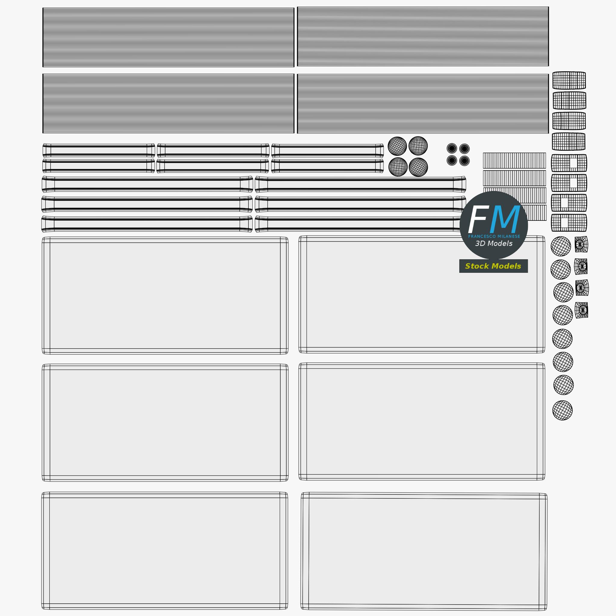 Easily customizable: UV unwrapped geometries; UV Layout maps provided in the package as png with alpha images.