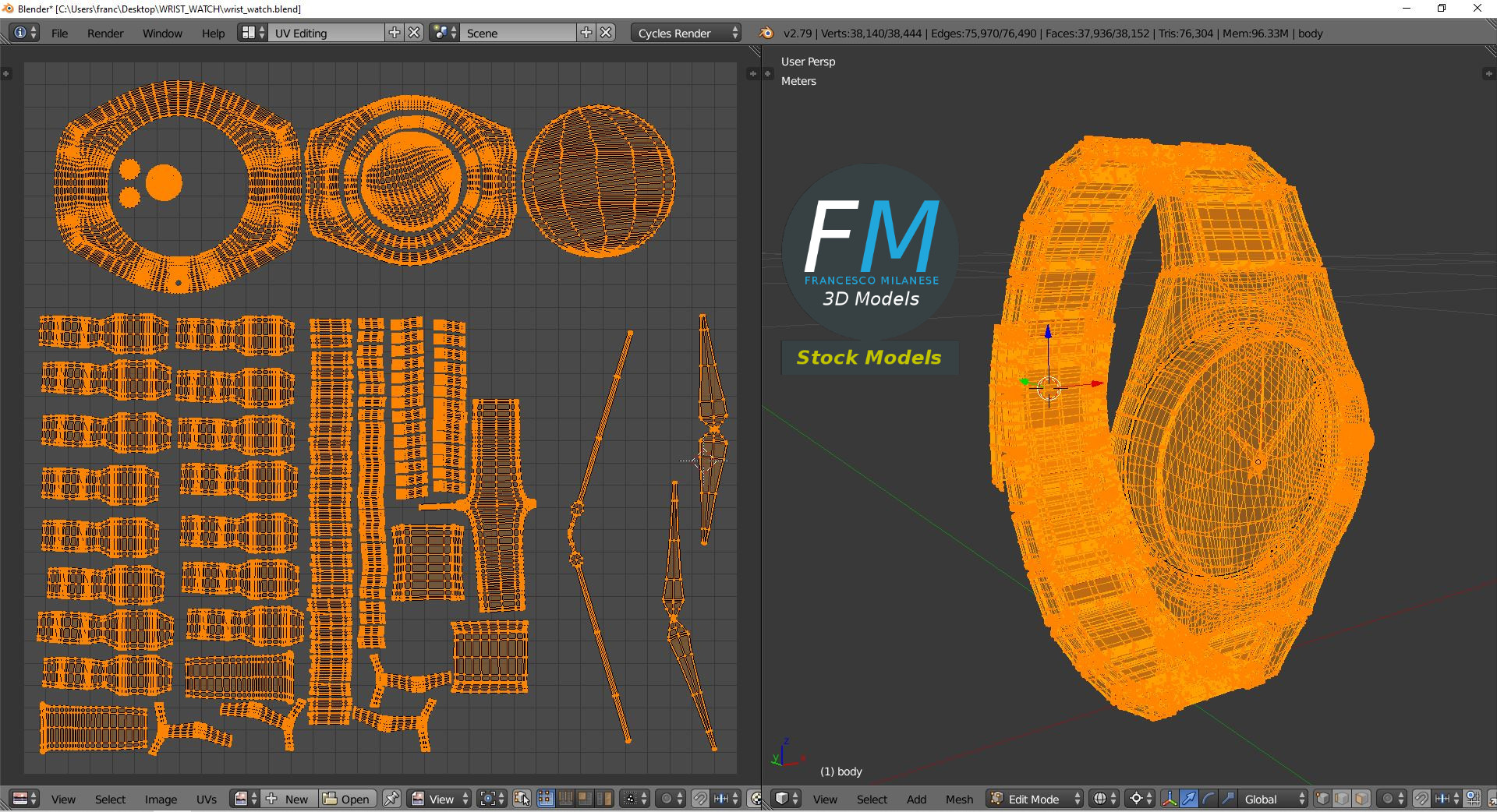 Wrist watch 3D Model. 6 individual objects sharing 2 non overlapping UV Layout maps, Materials (wrist watch; glass) and PBR Textures set. Production-ready 3D Model, with PBR materials, textures, non overlapping UV Layout map provided in the package.