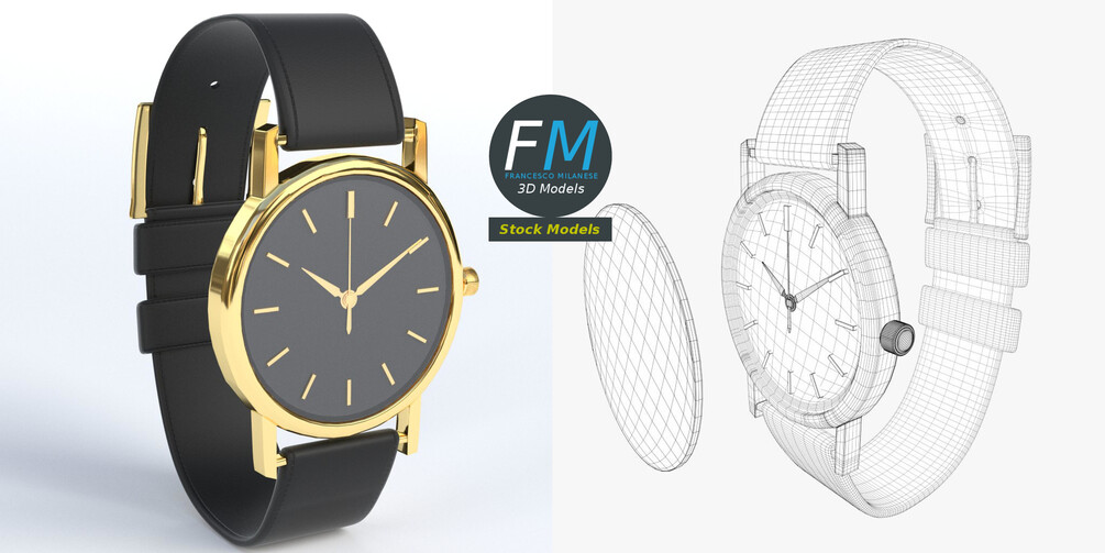 Wrist watch with leather watchstrap 3D Model. 3 individual objects (body, glass, watchstrap), each one with its own non overlapping UV Layout map, Material and PBR Textures set. Production-ready 3D Model, with PBR materials, textures, non overlapping UV Layout map provided in the package.