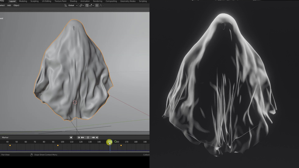 The ghost also moves up and down with an animation created by inserting keyframes at specific points on the Timeline, recording the Location information after repositioning the ghost.