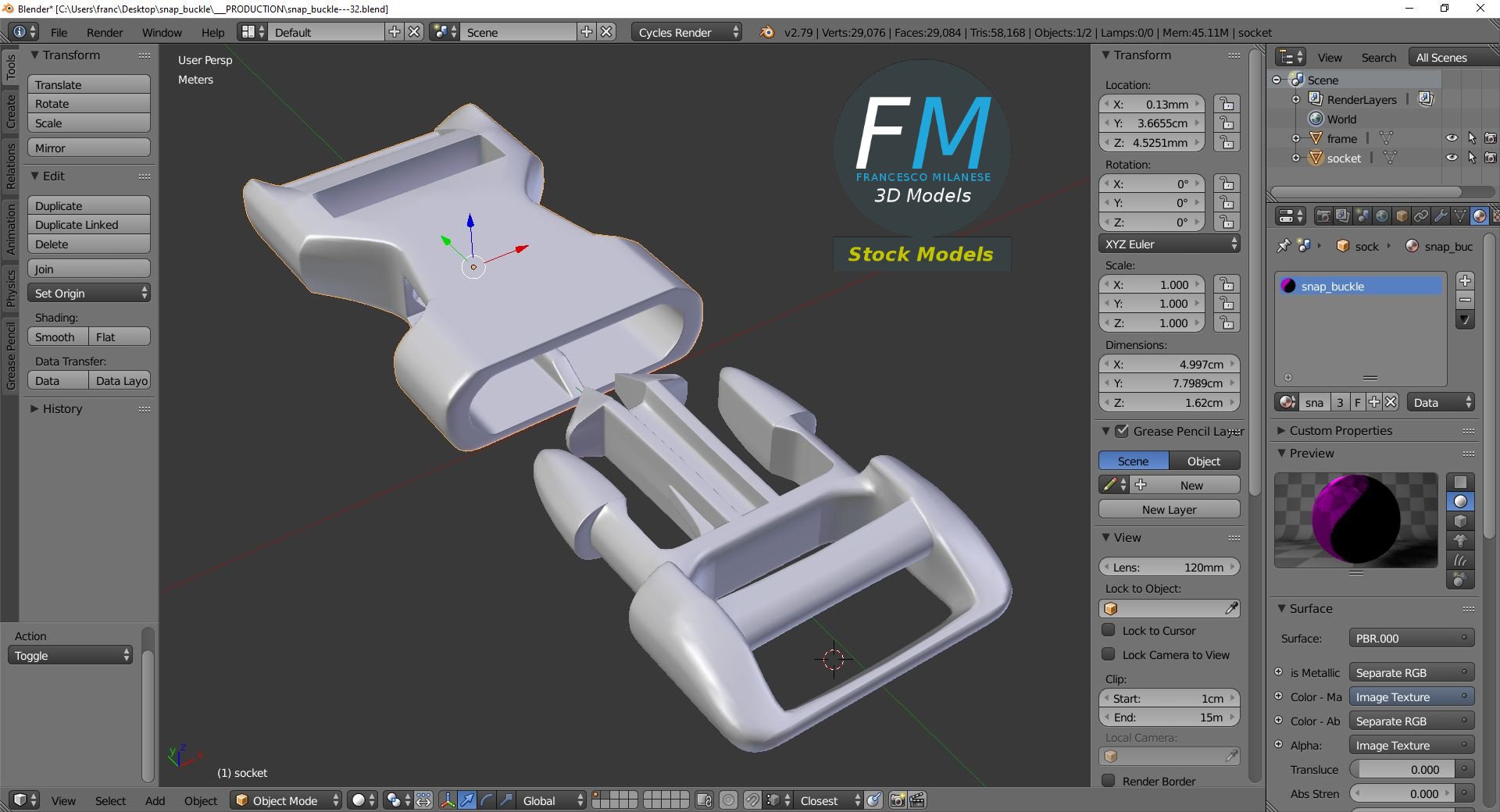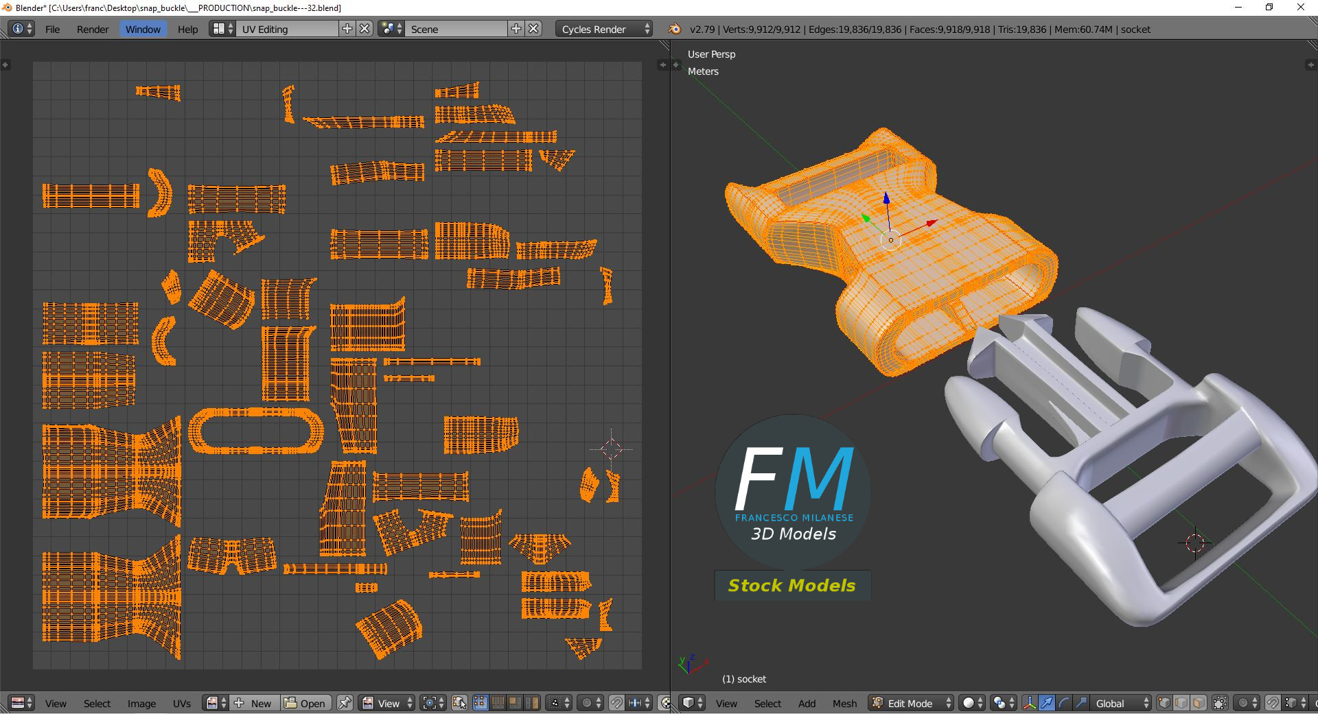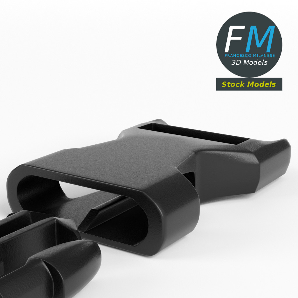 Snap (or: release) buckle 3D Model. 2 individual objects (frame, socket; so, you can easily move or even animate them), sharing the same non overlapping UV Layout map, Material and PBR Textures set. Production-ready 3D Model, with PBR materials, textures, non overlapping UV Layout map provided in the package.
